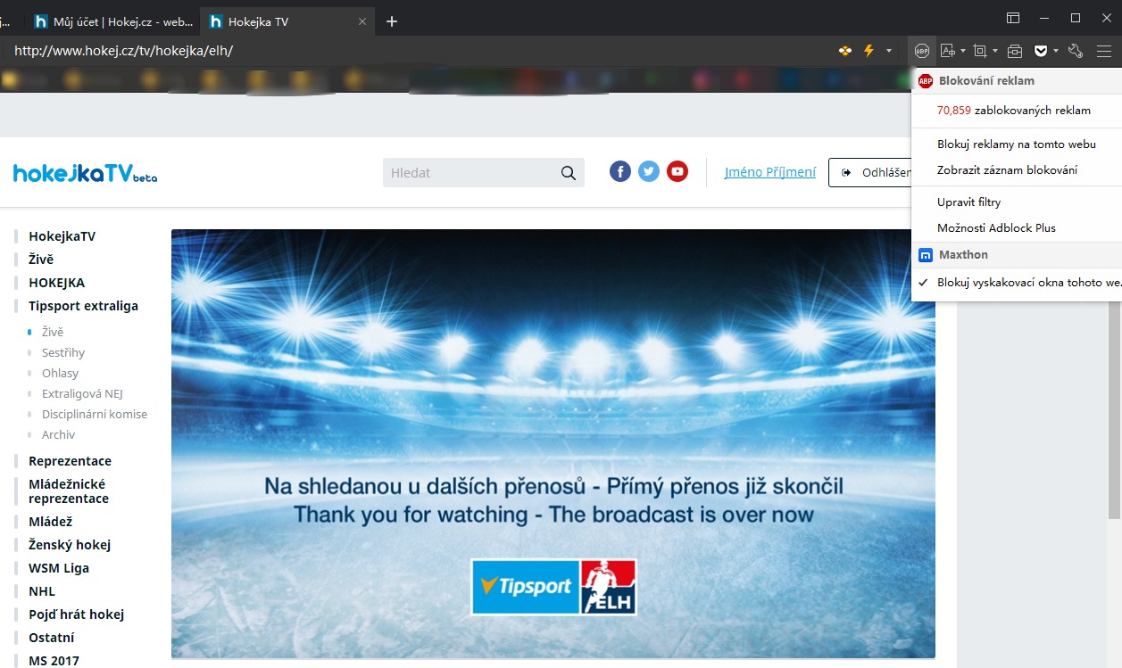 Ahoj vsem,poradte prosim proc nejde prehrat hokej,adblock je vypnutej